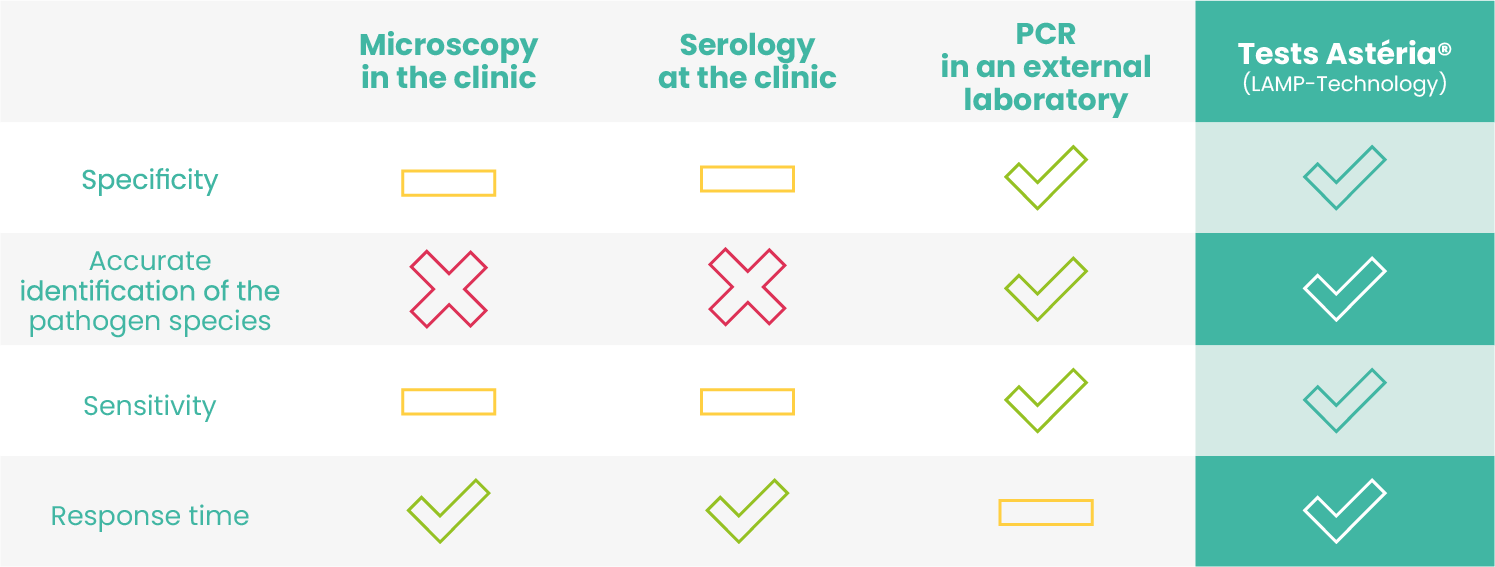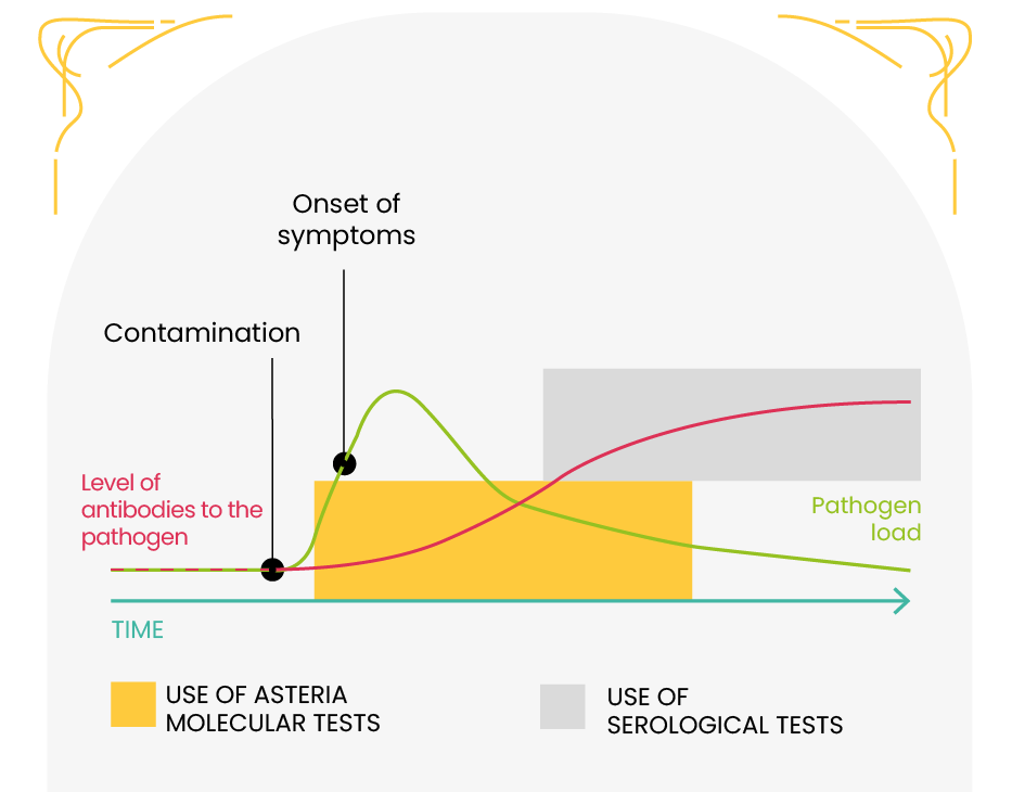 Our Asteria® tests are molecular biology tests. They directly detect the DNA of the pathogen and can therefore be used from the beginning of the infection even before symptoms are detectable or the immune response is put in place.